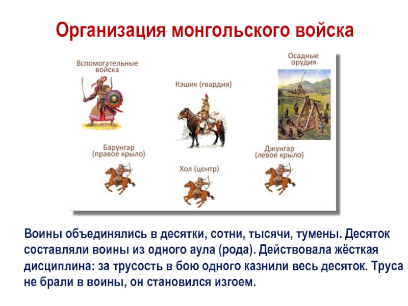 Военачальник в ходе сражения оставался за линией войск, в относительной безопасности, и руководил подчинёнными, поднимая на шесте цветные ленты – бунчуки. Монгольский лук бил значительно дальше европейского, а лёгкая изогнутая сабля позволяла долго вести бой.