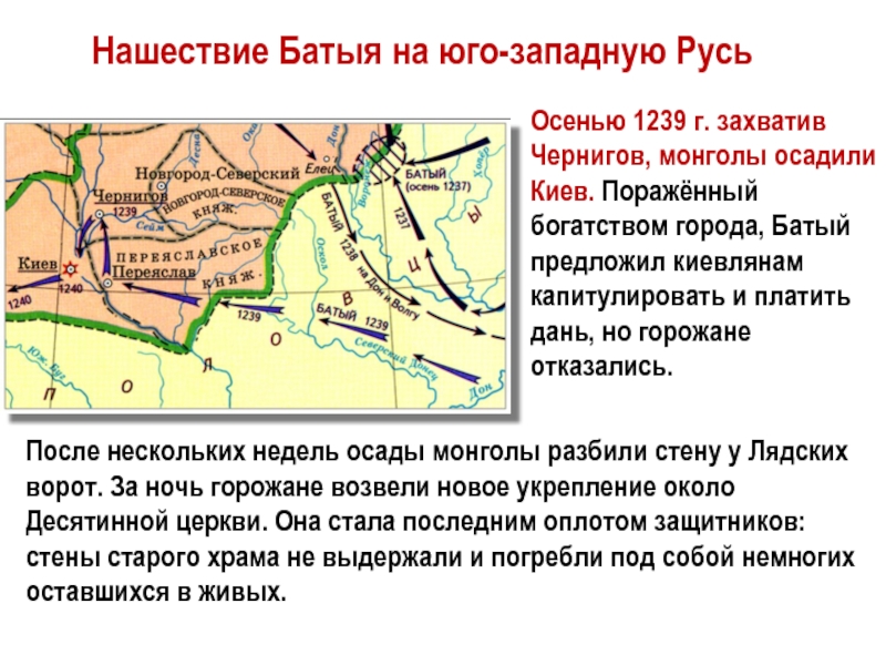 После нескольких недель осады монголы разбили стену у Лядских ворот. За ночь горожане возвели новое укрепление около Десятинной церкви. Она стала последним оплотом защитников: стены старого храма не выдержали и погребли под собой немногих оставшихся в живых.