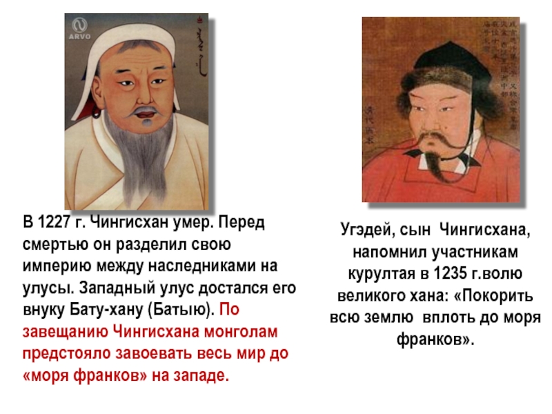 В 1227 г. Чингисхан умер. Перед смертью он разделил свою империю между наследниками на улусы. Западный улус достался его внуку Бату-хану (Батыю). По завещанию Чингисхана монголам предстояло завоевать весь мир до «моря франков» на западе.