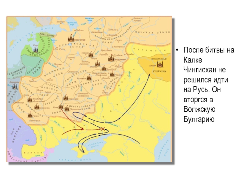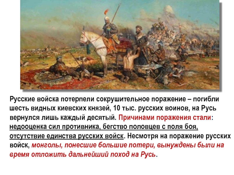 Они выступили навстречу монголам. Ложным отступлением те заманили русских и половцев к берегам р. Калки.