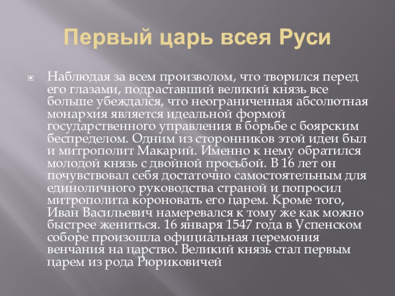глазами, подраставший великий князь все больше убеждался, что неограниченная абсолютная монархия является идеальной формой государственного управления в борьбе с боярским беспределом. Одним из сторонников этой идеи был и митрополит Макарий. Именно к нему обратился молодой князь с двойной просьбой. В 16 лет он почувствовал себя достаточно самостоятельным для единоличного руководства страной и попросил митрополита короновать его царем. Кроме того, Иван Васильевич намеревался к тому же как можно быстрее жениться. 16 января 1547 года в Успенском соборе произошла официальная церемония венчания на царство. Великий князь стал первым царем из рода Рюриковичей