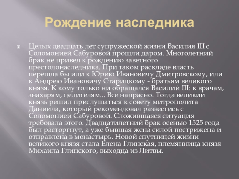 прошли даром. Многолетний брак не привел к рождению заветного престолонаследника. При таком раскладе власть перешла бы или к Юрию Ивановичу Дмитровскому, или к Андрею Ивановичу Старицкому - братьям великого князя. К кому только ни обращался Василий III: к врачам, знахарям, целителям... Все напрасно. Тогда великий князь решил прислушаться к совету митрополита Даниила, который рекомендовал развестись с Соломонией Сабуровой. Сложившаяся ситуация требовала этого. Двадцатилетний брак осенью 1525 года был расторгнут, а уже бывшая жена силой пострижена и отправлена в монастырь. Новой спутницей жизни великого князя стала Елена Глинская, племянница князя Михаила Глинского, выходца из Литвы.