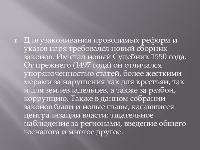 Им стал новый Судебник 1550 года. От прежнего (1497 года) он отличался упорядоченностью статей, более жесткими мерами за нарушения как для крестьян, так и для землевладельцев, а также за разбой, коррупцию. Также в данном собрании законов были и новые главы, касавшиеся централизации власти: тщательное наблюдение за регионами, введение общего госналога и многое другое.