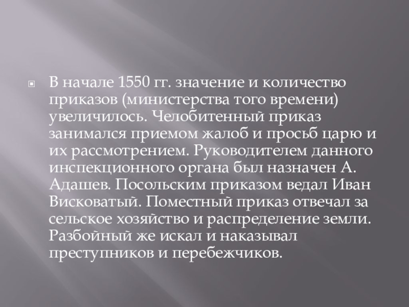 увеличилось. Челобитенный приказ занимался приемом жалоб и просьб царю и их рассмотрением. Руководителем данного инспекционного органа был назначен А. Адашев. Посольским приказом ведал Иван Висковатый. Поместный приказ отвечал за сельское хозяйство и распределение земли. Разбойный же искал и наказывал преступников и перебежчиков.