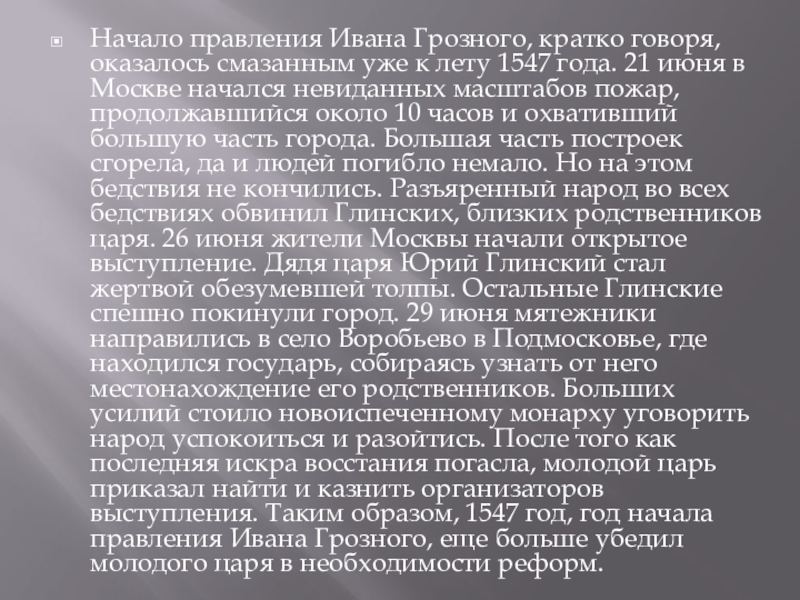 1547 года. 21 июня в Москве начался невиданных масштабов пожар, продолжавшийся около 10 часов и охвативший большую часть города. Большая часть построек сгорела, да и людей погибло немало. Но на этом бедствия не кончились. Разъяренный народ во всех бедствиях обвинил Глинских, близких родственников царя. 26 июня жители Москвы начали открытое выступление. Дядя царя Юрий Глинский стал жертвой обезумевшей толпы. Остальные Глинские спешно покинули город. 29 июня мятежники направились в село Воробьево в Подмосковье, где находился государь, собираясь узнать от него местонахождение его родственников. Больших усилий стоило новоиспеченному монарху уговорить народ успокоиться и разойтись. После того как последняя искра восстания погасла, молодой царь приказал найти и казнить организаторов выступления. Таким образом, 1547 год, год начала правления Ивана Грозного, еще больше убедил молодого царя в необходимости реформ.