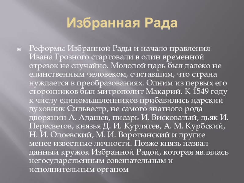 один временной отрезок не случайно. Молодой царь был далеко не единственным человеком, считавшим, что страна нуждается в преобразованиях. Одним из первых его сторонников был митрополит Макарий. К 1549 году к числу единомышленников прибавились царский духовник Сильвестр, не самого знатного рода дворянин А. Адашев, писарь И. Висковатый, дьяк И. Пересветов, князья Д. И. Курлятев, А. М. Курбский, Н. И. Одоевский, М. И. Воротынский и другие менее известные личности. Позже князь назвал данный кружок Избранной Радой, которая являлась негосударственным совещательным и исполнительным органом