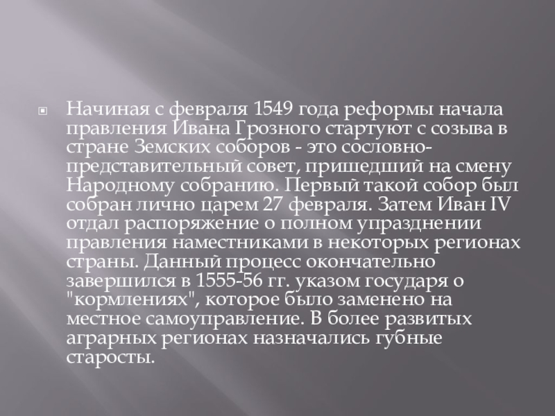 с созыва в стране Земских соборов - это сословно-представительный совет, пришедший на смену Народному собранию. Первый такой собор был собран лично царем 27 февраля. Затем Иван IV отдал распоряжение о полном упразднении правления наместниками в некоторых регионах страны. Данный процесс окончательно завершился в 1555-56 гг. указом государя о "кормлениях", которое было заменено на местное самоуправление. В более развитых аграрных регионах назначались губные старосты.
