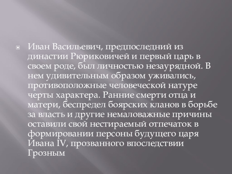 роде, был личностью незаурядной. В нем удивительным образом уживались, противоположные человеческой натуре черты характера. Ранние смерти отца и матери, беспредел боярских кланов в борьбе за власть и другие немаловажные причины оставили свой нестираемый отпечаток в формировании персоны будущего царя Ивана IV, прозванного впоследствии Грозным