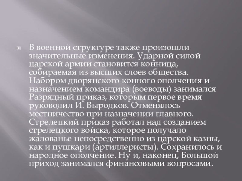 становится конница, собираемая из высших слоев общества. Набором дворянского конного ополчения и назначением командира (воеводы) занимался Разрядный приказ, которым первое время руководил И. Выродков. Отменялось местничество при назначении главного. Стрелецкий приказ работал над созданием стрелецкого войска, которое получало жалованье непосредственно из царской казны, как и пушкари (артиллеристы). Сохранилось и народное ополчение. Ну и, наконец, Большой приход занимался финансовыми вопросами.