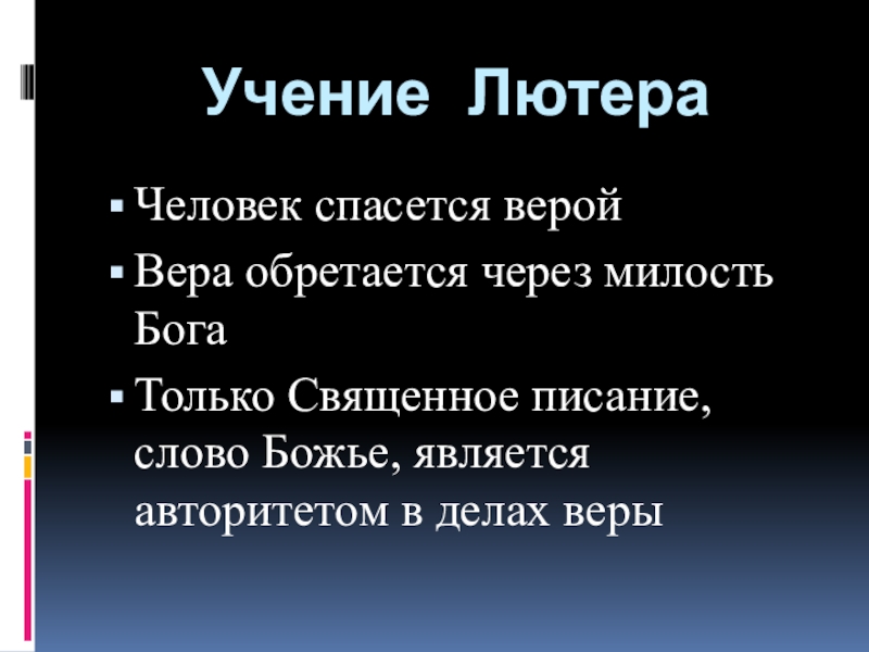 Учение ЛютераЧеловек спасется веройВера обретается через милость БогаТолько Священное писание, слово Божье, является авторитетом в делах веры
