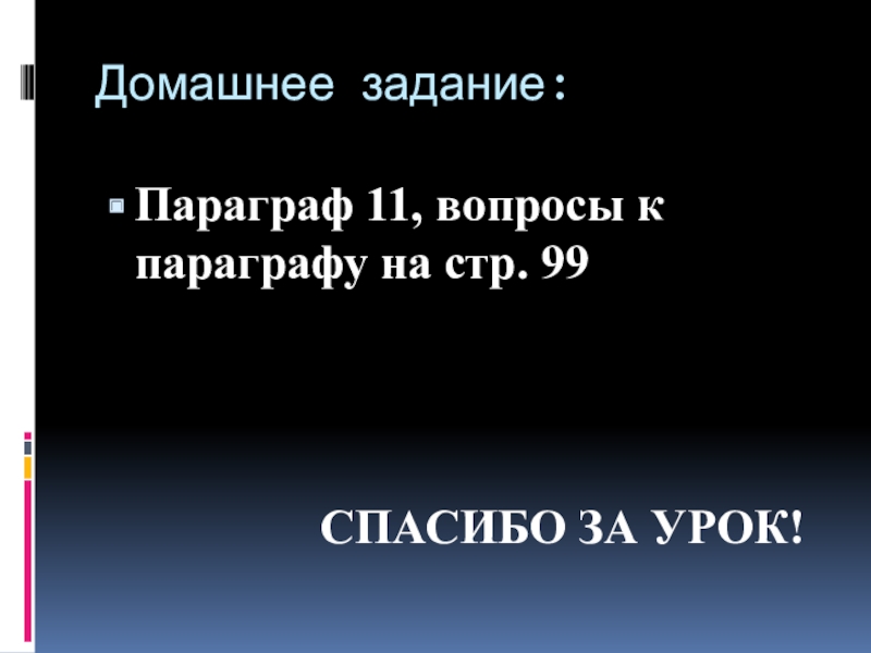 Домашнее задание:Параграф 11, вопросы к параграфу на стр. 99