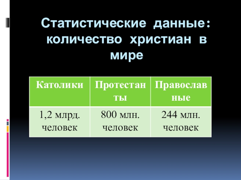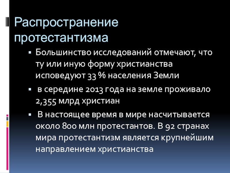 Распространение протестантизмаБольшинство исследований отмечают, что ту или иную форму христианства исповедуют 33 % населения Земли в середине