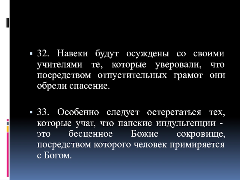 33. Особенно следует остерегаться тех, которые учат, что папские индульгенции - это бесценное Божие сокровище, посредством которого человек примиряется с Богом.