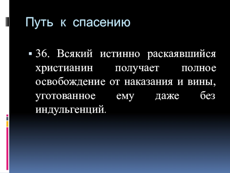 Путь к спасению36. Всякий истинно раскаявшийся христианин получает полное освобождение от наказания и вины, уготованное ему даже