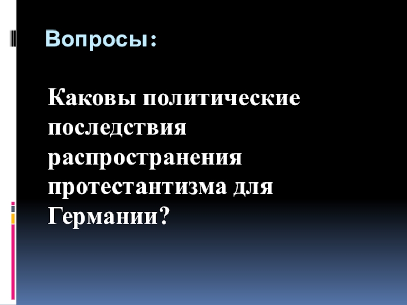 Вопросы:Каковы политические последствия распространения протестантизма для Германии?