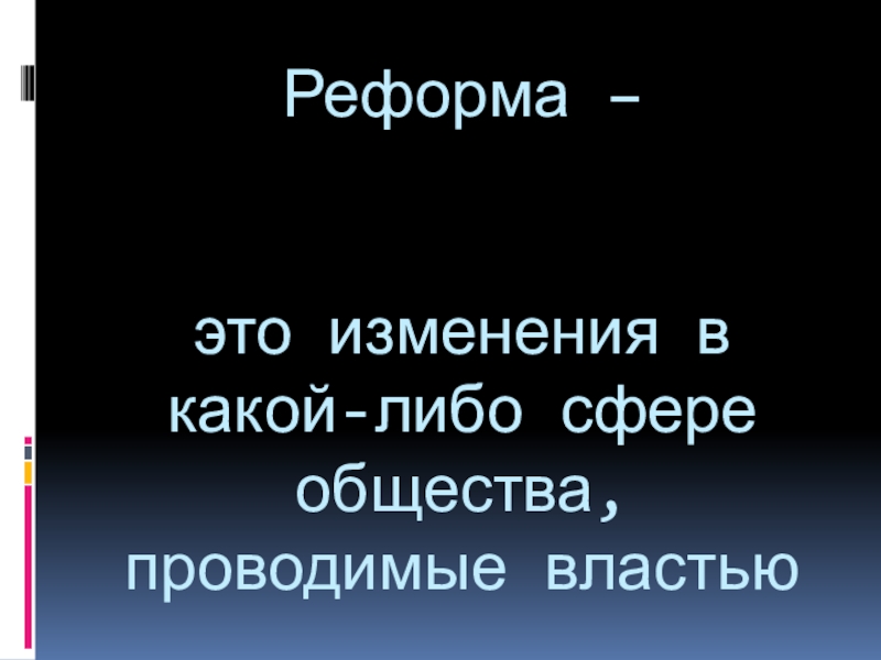Слайд 2Реформа – это изменения в какой-либо сфере общества, проводимые властью