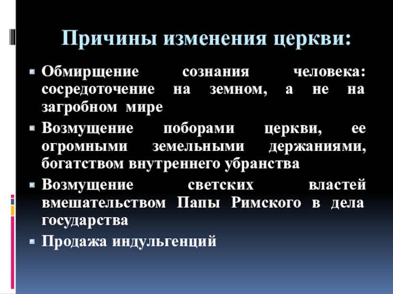 Причины изменения церкви:Обмирщение сознания человека: сосредоточение на земном, а не на загробном миреВозмущение поборами церкви, ее огромными