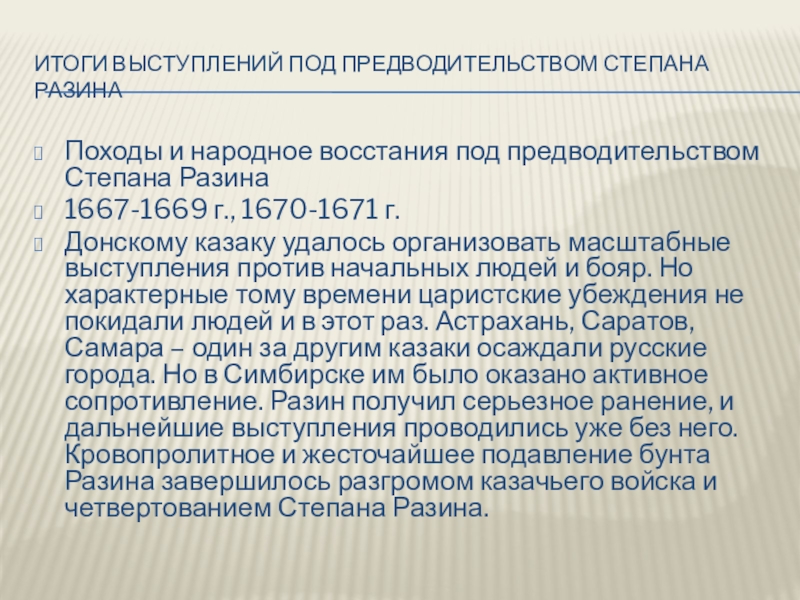 Слайд 12Итоги выступлений под предводительством Степана Разина