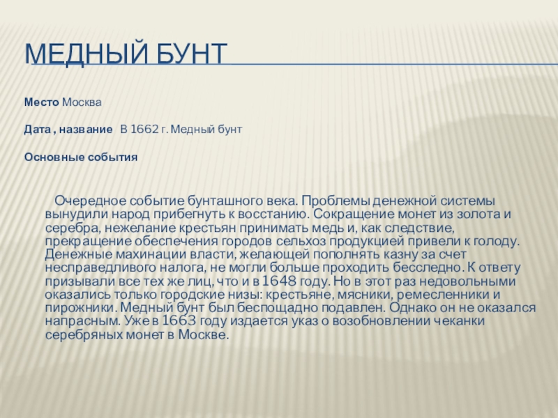 Дата , название В 1662 г. Медный бунт