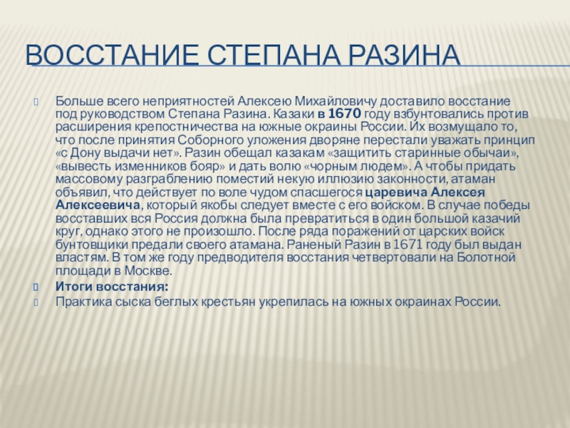 Степана Разина. Казаки в 1670 году взбунтовались против расширения крепостничества на южные окраины России. Их возмущало то, что после принятия Соборного уложения дворяне перестали уважать принцип «с Дону выдачи нет». Разин обещал казакам «защитить старинные обычаи», «вывесть изменников бояр» и дать волю «чорным людем». А чтобы придать массовому разграблению поместий некую иллюзию законности, атаман объявил, что действует по воле чудом спасшегося царевича Алексея Алексеевича, который якобы следует вместе с его войском. В случае победы восставших вся Россия должна была превратиться в один большой казачий круг, однако этого не произошло. После ряда поражений от царских войск бунтовщики предали своего атамана. Раненый Разин в 1671 году был выдан властям. В том же году предводителя восстания четвертовали на Болотной площади в Москве.