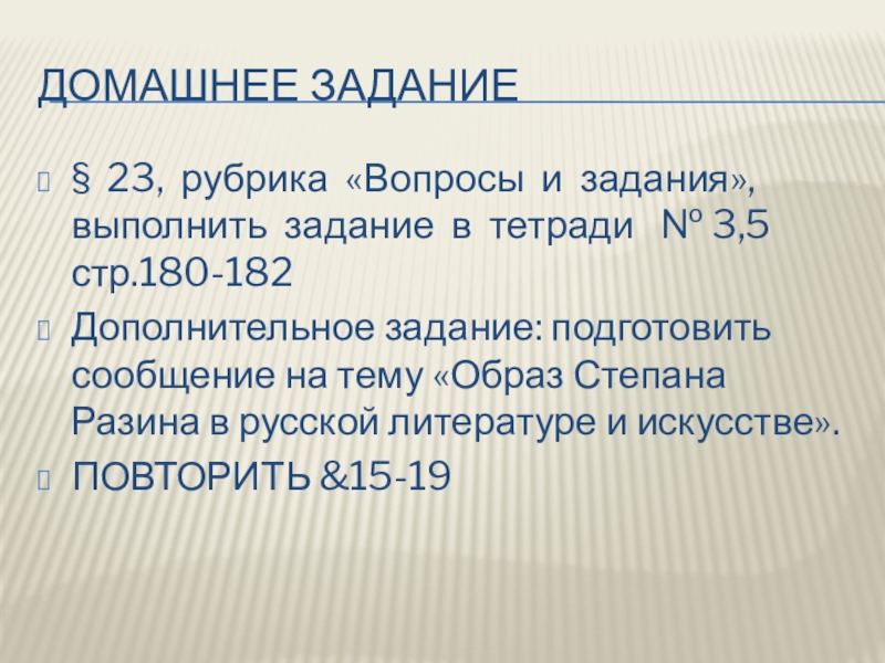 Дополнительное задание: подготовить сообщение на тему «Образ Степана Разина в русской литературе и искусстве».
