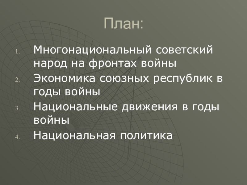 План:Многонациональный советский народ на фронтах войныЭкономика союзных республик в годы войныНациональные движения в годы войныНациональная политика