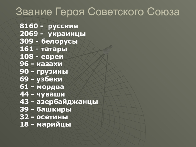 Звание Героя Советского Союза8160 - русские2069 - украинцы309 - белорусы161 - татары108 - евреи96 - казахи90 -