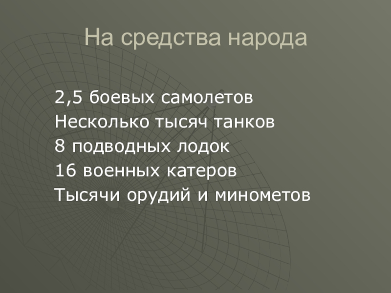 На средства народа2,5 боевых самолетовНесколько тысяч танков8 подводных лодок16 военных катеровТысячи орудий и минометов