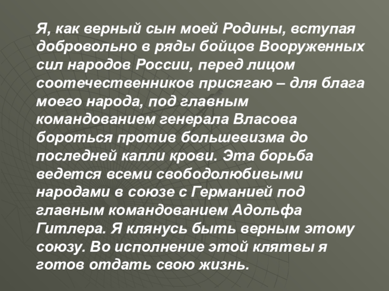 Вооруженных сил народов России, перед лицом соотечественников присягаю – для блага моего народа, под главным командованием генерала Власова бороться против большевизма до последней капли крови. Эта борьба ведется всеми свободолюбивыми народами в союзе с Германией под главным командованием Адольфа Гитлера. Я клянусь быть верным этому союзу. Во исполнение этой клятвы я готов отдать свою жизнь.