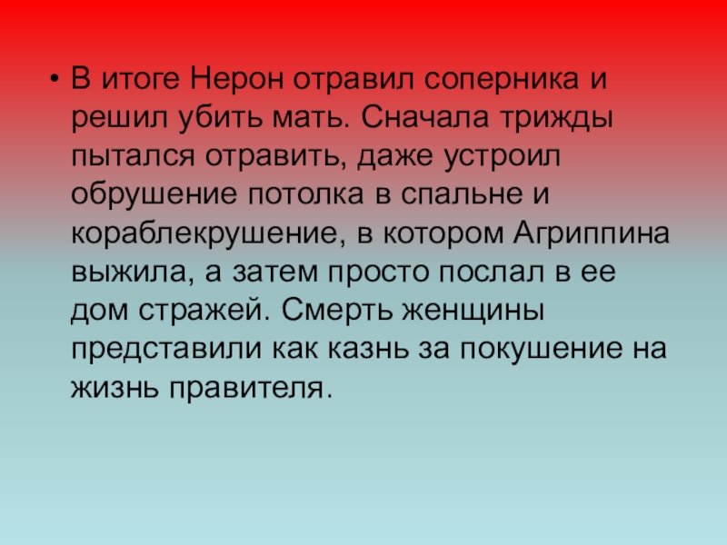Слайд 13В итоге Нерон отравил соперника и решил убить мать. Сначала трижды