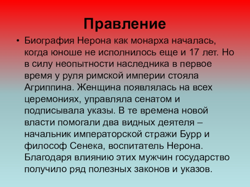 17 лет. Но в силу неопытности наследника в первое время у руля римской империи стояла Агриппина. Женщина появлялась на всех церемониях, управляла сенатом и подписывала указы. В те времена новой власти помогали два видных деятеля – начальник императорской стражи Бурр и философ Сенека, воспитатель Нерона. Благодаря влиянию этих мужчин государство получило ряд полезных законов и указов.