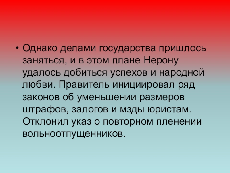 Слайд 16Однако делами государства пришлось заняться, и в этом плане Нерону удалось