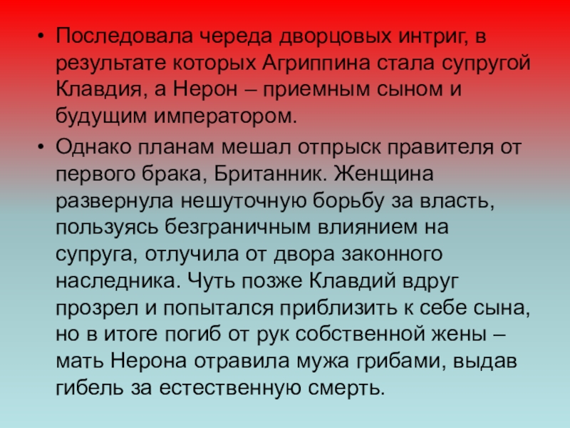 Слайд 7Последовала череда дворцовых интриг, в результате которых Агриппина стала супругой Клавдия,
