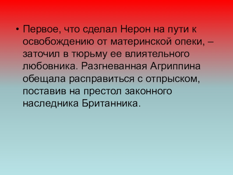 Слайд 12Первое, что сделал Нерон на пути к освобождению от материнской опеки,