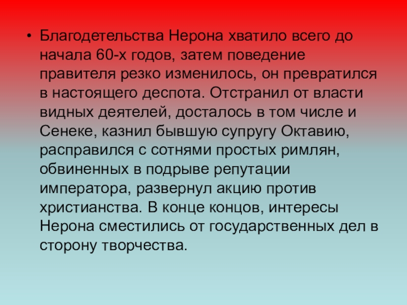 резко изменилось, он превратился в настоящего деспота. Отстранил от власти видных деятелей, досталось в том числе и Сенеке, казнил бывшую супругу Октавию, расправился с сотнями простых римлян, обвиненных в подрыве репутации императора, развернул акцию против христианства. В конце концов, интересы Нерона сместились от государственных дел в сторону творчества.