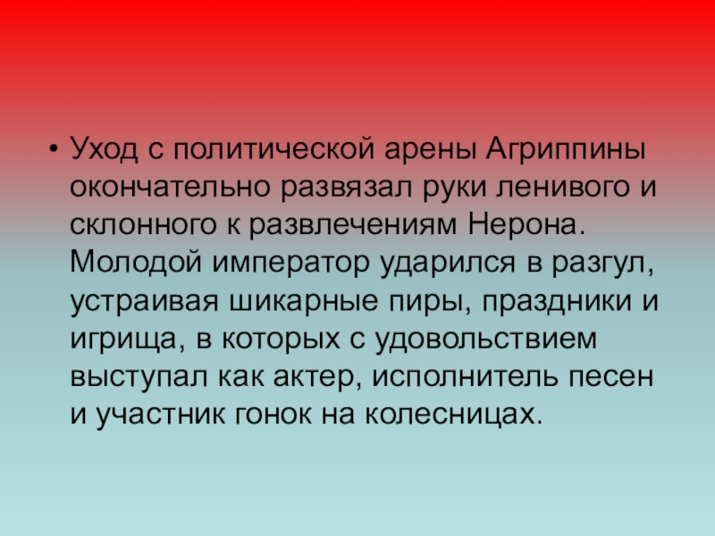 Слайд 14Уход с политической арены Агриппины окончательно развязал руки ленивого и склонного
