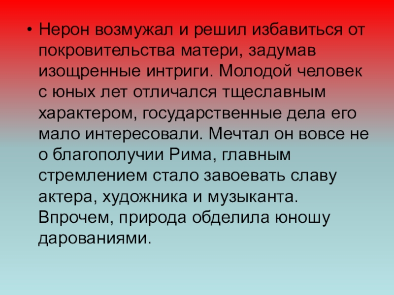 Слайд 10Нерон возмужал и решил избавиться от покровительства матери, задумав изощренные интриги.
