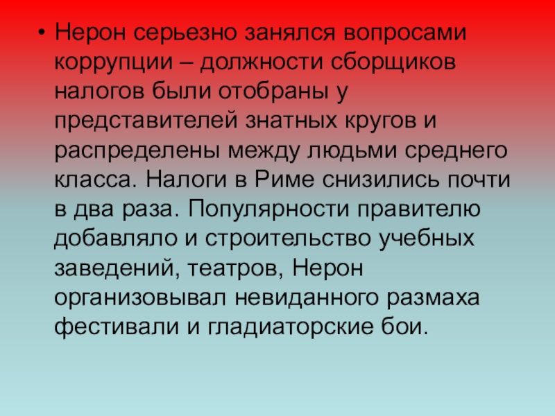 у представителей знатных кругов и распределены между людьми среднего класса. Налоги в Риме снизились почти в два раза. Популярности правителю добавляло и строительство учебных заведений, театров, Нерон организовывал невиданного размаха фестивали и гладиаторские бои.