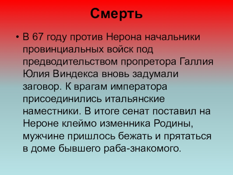 Галлия Юлия Виндекса вновь задумали заговор. К врагам императора присоединились итальянские наместники. В итоге сенат поставил на Нероне клеймо изменника Родины, мужчине пришлось бежать и прятаться в доме бывшего раба-знакомого.