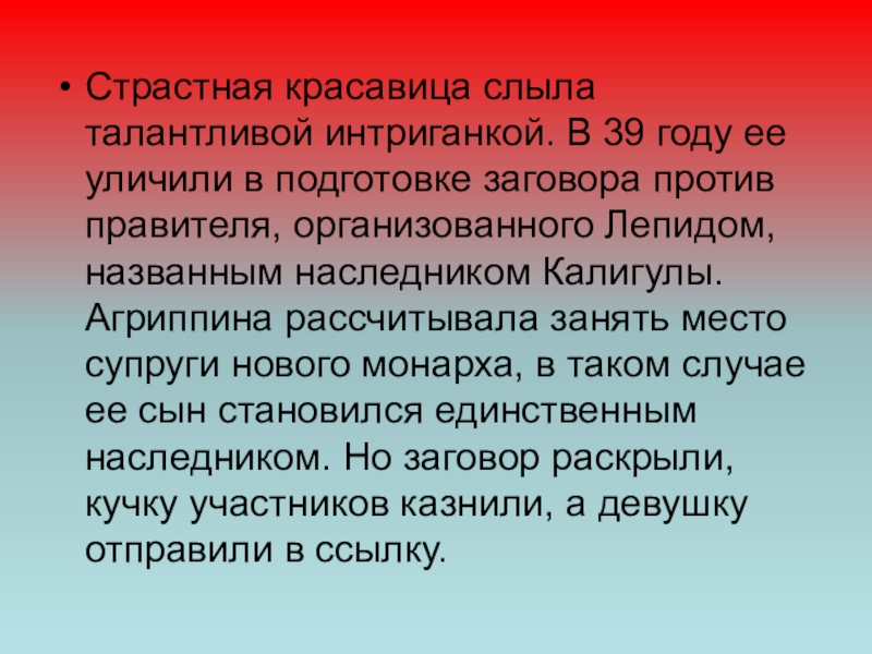 Слайд 5Страстная красавица слыла талантливой интриганкой. В 39 году ее уличили в