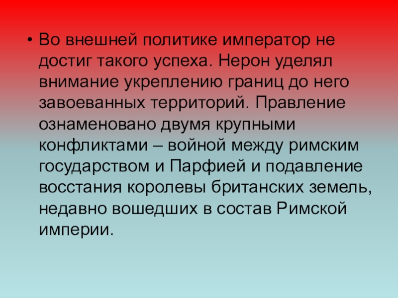 Слайд 18Во внешней политике император не достиг такого успеха. Нерон уделял внимание