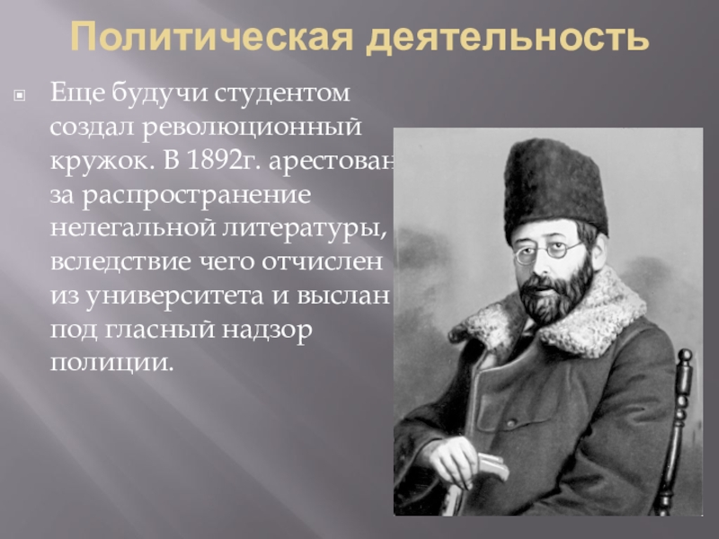 Политическая деятельностьЕще будучи студентом создал революционный кружок. В 1892г. арестован за распространение нелегальной литературы, вследствие чего отчислен