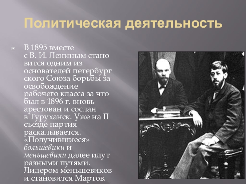 Политическая деятельность В 1895 вместе с В. И. Лениным становится одним из основателей петербургского Союза борьбы за освобождение рабочего класса за что был