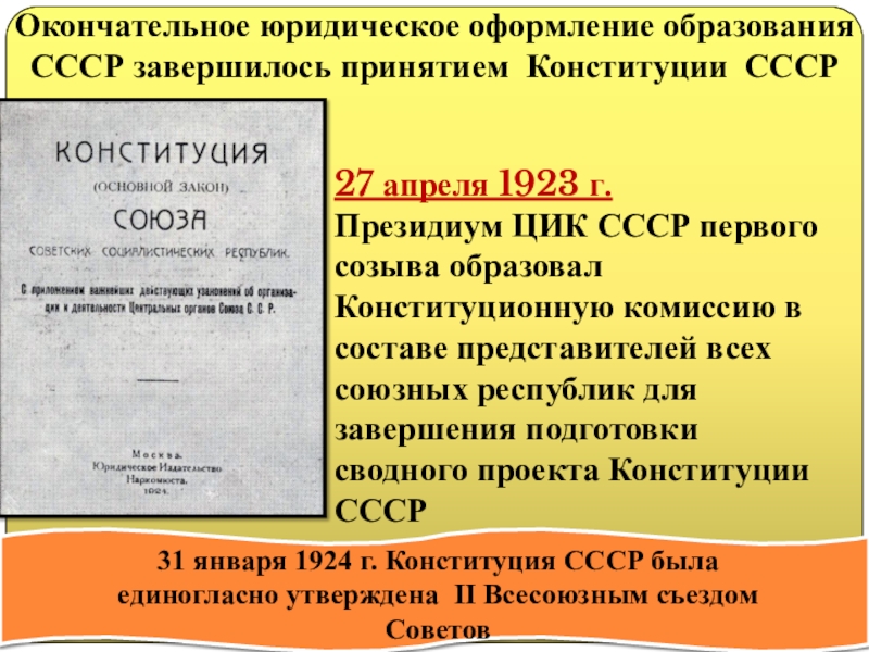 31 января 1924 г. Конституция СССР была единогласно утверждена II Всесоюзным съездом Советов