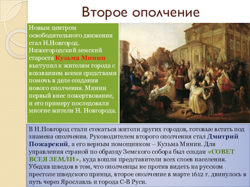 В Н.Новгород стали стекаться жители других городов, готовые встать под знамена ополчения. Руководителем второго ополчения стал Дмитрий Пожарский, а его верным помощником – Кузьма Минин. Для управления страной по образцу Земского собора был создан «Совет всея земли», куда вошли представители всех слоев населения. Убедив шведов в том, что ополченцы не против видеть на русском престоле шведского принца, второе ополчение в марте 1612 г. двинулось в путь через Ярославль и города С-В Руси.