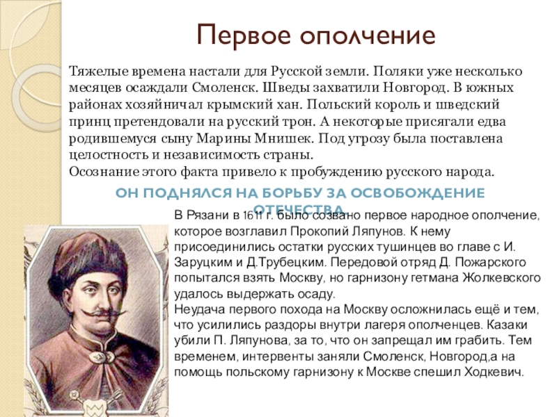 В Рязани в 1611 г. было созвано первое народное ополчение, которое возглавил Прокопий Ляпунов. К нему присоединились остатки русских тушинцев во главе с И. Заруцким и Д.Трубецким. Передовой отряд Д. Пожарского попытался взять Москву, но гарнизону гетмана Жолкевского удалось выдержать осаду.