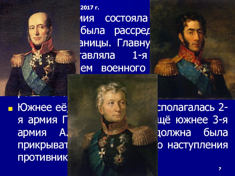 Слайд 7Русская армия состояла из 210 тыс. человек и была рассредоточена вдоль