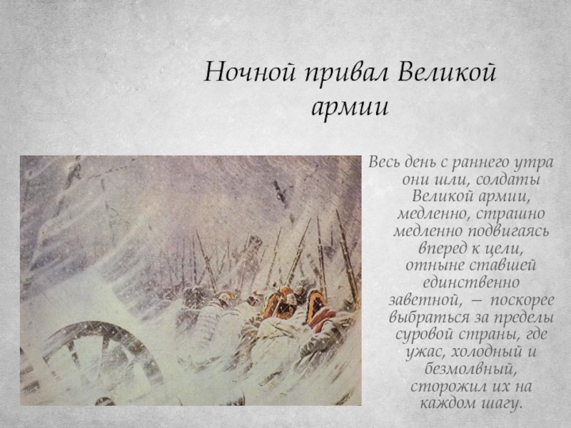 Великой армии, медленно, страшно медленно подвигаясь вперед к цели, отныне ставшей единственно заветной, — поскорее выбраться за пределы суровой страны, где ужас, холодный и безмолвный, сторожил их на каждом шагу.