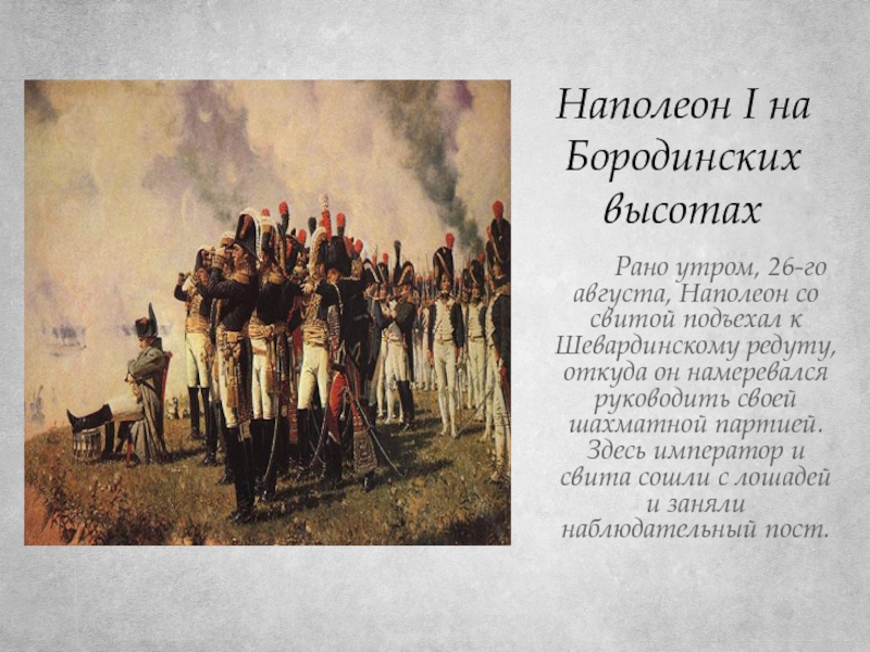 26-го августа, Наполеон со свитой подъехал к Шевардинскому редуту, откуда он намеревался руководить своей шахматной партией. Здесь император и свита сошли с лошадей и заняли наблюдательный пост.