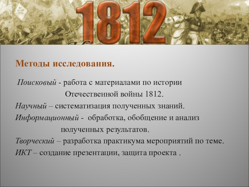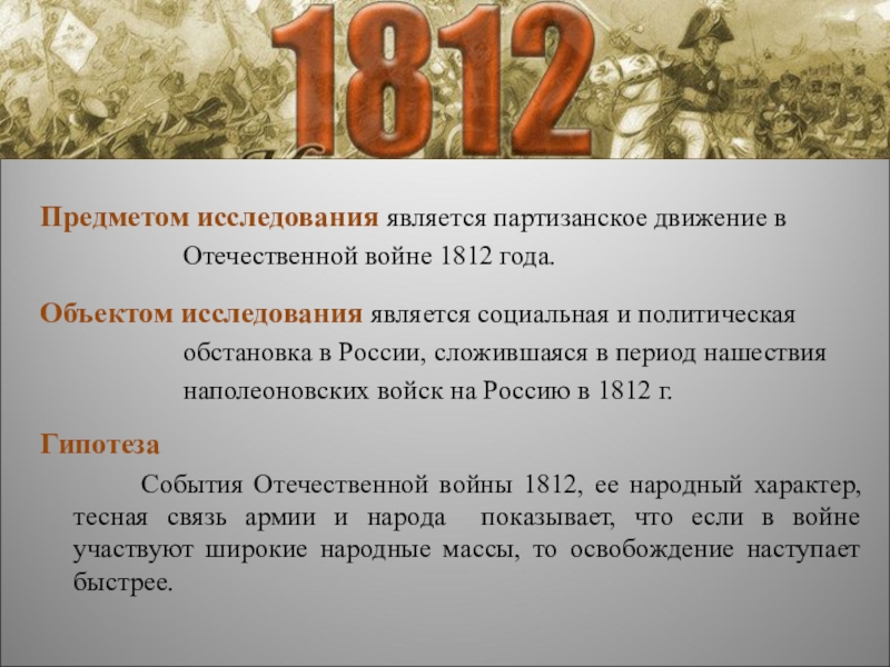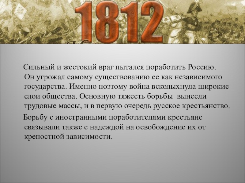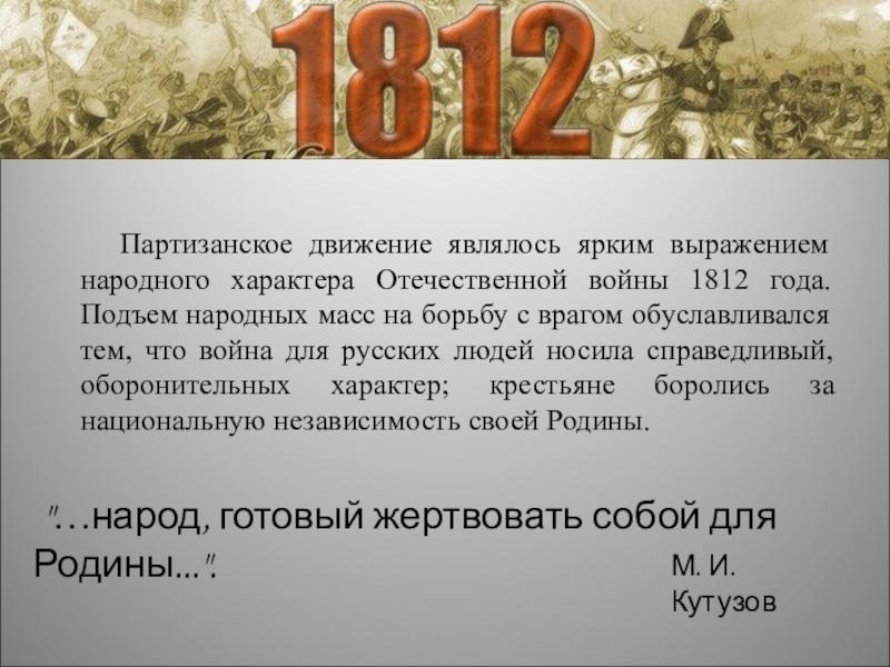 войны 1812 года. Подъем народных масс на борьбу с врагом обуславливался тем, что война для русских людей носила справедливый, оборонительных характер; крестьяне боролись за национальную независимость своей Родины.